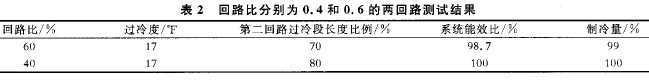 根據(jù)模擬結(jié)果,在一臺機組上分別測試了回路比為0.6的兩回路與回路比為0.4的兩回路的性能,結(jié)果如表2所示。其中過冷段長度比例通過熱成像拍攝照片估算得出,測試結(jié)果與模擬結(jié)果基本吻合。