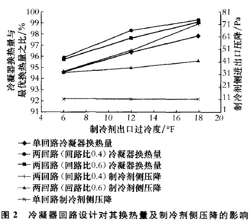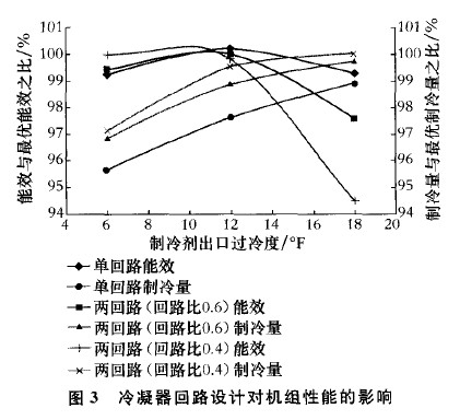 模擬結(jié)果表明,該機組冷凝器的較優(yōu)設(shè)計方案為回路比為0.4的兩回路,過冷度優(yōu)化在10~ 12。F。以上各種回路的設(shè)計方案對系統(tǒng)的制冷量及能效的影響在2 -5 范圍內(nèi)。