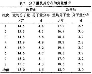 從檢測結(jié)果可知,改善前后聚合物的分子量及其分布發(fā)生了顯著變化,改善后分子量變高,分子量分布變窄。