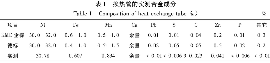 B30換熱管的實(shí)測合金成分如表1所示。由表1可知,該管段的實(shí)測合金成分均滿足德國KME公司企標(biāo)和德國標(biāo)準(zhǔn)要求,表明該管線的成分滿足設(shè)計(jì)要求。