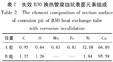 腐蝕坑表面外圍(A處)和底部(B處)的SEM及EDS結(jié)果如圖7和表2所示,可見,在蝕坑外,Ni元素含量32.08%(ω),Cu元素含量為64.89%(ω),材料成分符合B30合金特征;在蝕坑內(nèi),Ni元素的較低含量僅1.84%,遠(yuǎn)低于B30合金的Ni含量。