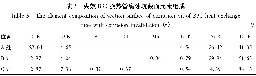 腐蝕坑內(nèi)部截面的SEM及EDS結(jié)果如圖8和表3所示,可以看出,A處位于材料內(nèi)部,B處位于腐蝕坑底部,C處為腐蝕坑底部顆粒狀物質(zhì)表面,A、B兩處Ni元素含量相差不大,分別為26.42%和29.84%,C處Ni元素含量很少而Cu元素富集。同時(shí),根據(jù)Pourbaix圖,在酸性、中性和弱堿性環(huán)境中,銅的電位均正于鎳90mV左右,只有到了強(qiáng)堿性溶液中(PH>13),鎳的電位才比銅正。該B30換熱管內(nèi)部環(huán)境為具有弱堿性的海水,因此在高富Cu相的周圍,富Ni相會(huì)優(yōu)先發(fā)生腐蝕,當(dāng)包圍高富Cu相的富Ni相腐蝕到一定程度后,高富Cu相脫落,造成較深的腐蝕坑,成為管路中的薄弱區(qū)域,當(dāng)腐蝕進(jìn)一步發(fā)生后,可能導(dǎo)致腐蝕穿孔,進(jìn)而發(fā)生泄漏。